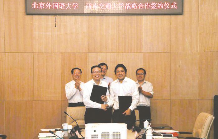 签约仪式在北京外国语大学行政楼507会议室举行。北京外国语大学校长彭龙,副校长贾德忠,校长助理、综合改革办公室主任杨建国;西南交大校长徐飞,校党委副书记陈志坚等出席仪式。仪式由北京外国语大学党委副书记赵旻主持。