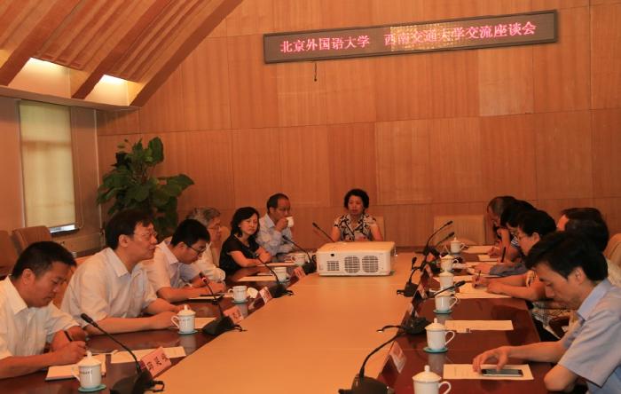 9月9日上午,双方在北京外国语大学行政楼507会议室举行交流座谈会,就文科基地建设、基金项目申报、智库建设、期刊数据库建设、国外高校联合办学等方面进行了充分交流。北京外国语大学党委副书记赵旻,西南交大党委副书记陈志坚等出席会议。