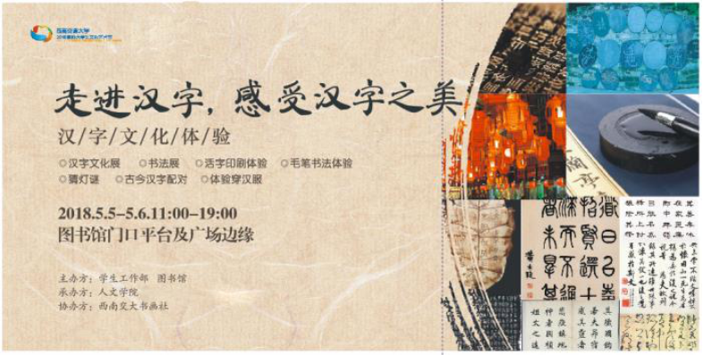 汉字,形美如画,音美如歌,意美如诗。为进一步弘扬中华传统文化,认识汉字丰富的造型变化与内涵魅力,培育交大学子的人文情怀与良好品格,2018国际大学生文化艺术节系列活动——中华优秀传统文化体验走进汉字,感受汉字之美将于201855日、6日在犀浦校区图书馆二楼举办,让我们一起走进汉字,在体验中感悟凝结在汉字中的中华传统文化的精髓和无限魅力,欢迎广大师生积极参与!活动由展示类体验类两部分组成。